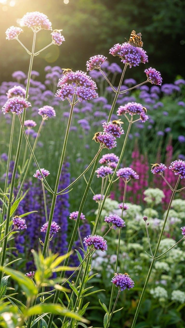 Often towering above mixed borders, Verbena bonariensis offers lanky stems topped with clusters of tiny purple flowers that attract pollinators and give a garden airy vertical interest.