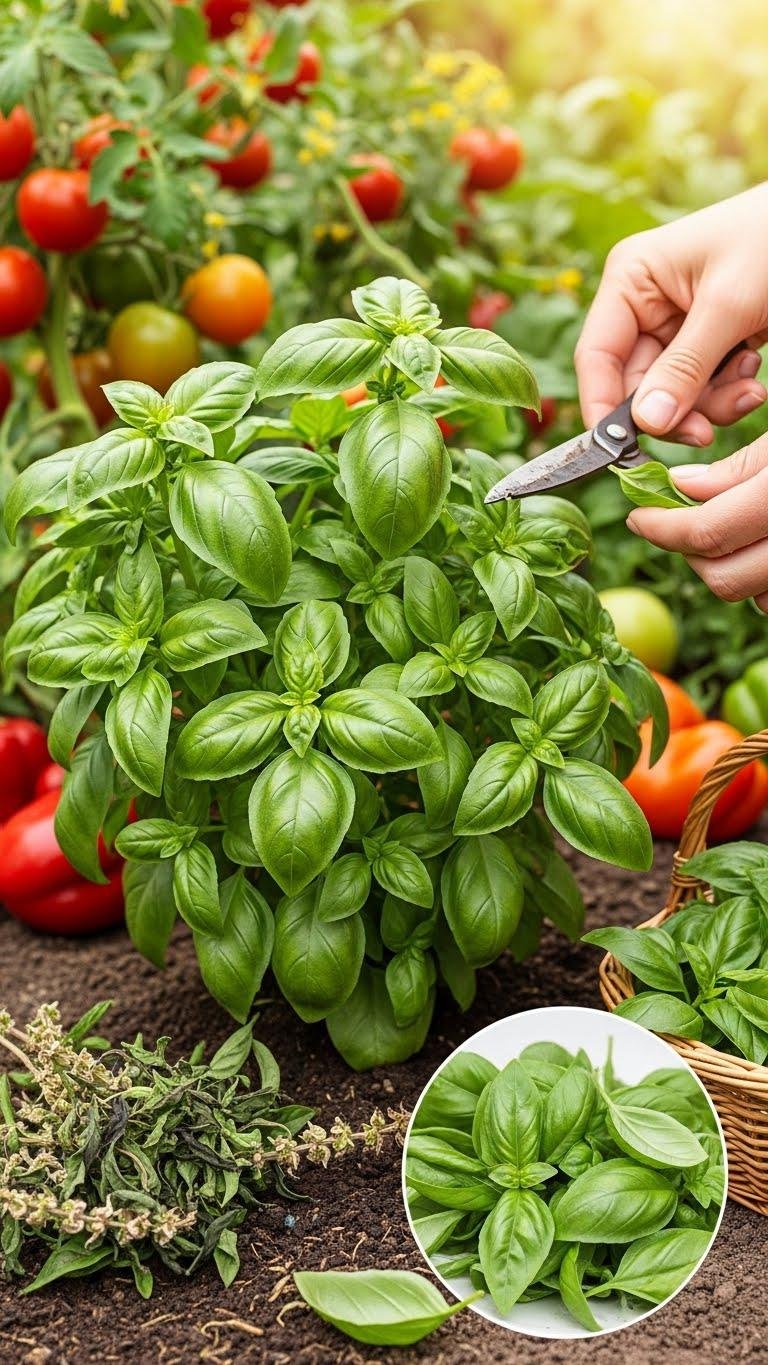 You’ll prune regularly to encourage bushy growth, use companion planting with tomatoes and peppers, harvest before flowering for flavor preservation, and dry or freeze leaves for year-round use while keeping plants vigorous and free.