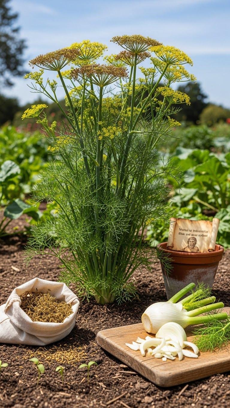 Plant fennel (Foeniculum vulgare) where it gets full sun and rich, well‑drained soil, and you’ll be rewarded with feathery foliage, tall bronze‑topped umbels of yellow flowers, and a harvestable stalk, fronds, and seeds.