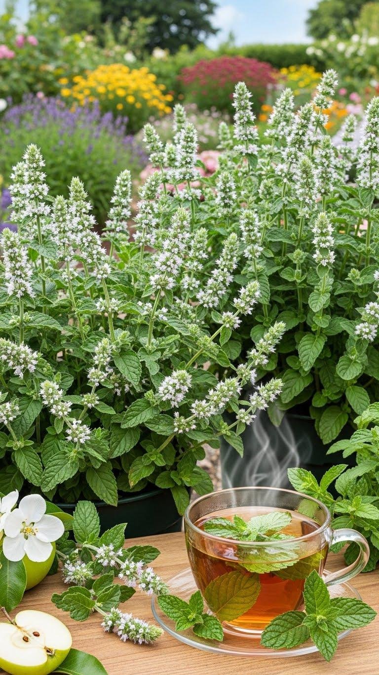 Harvest leaves for tea; note documented medicinal uses like mild antiseptic and digestive support.