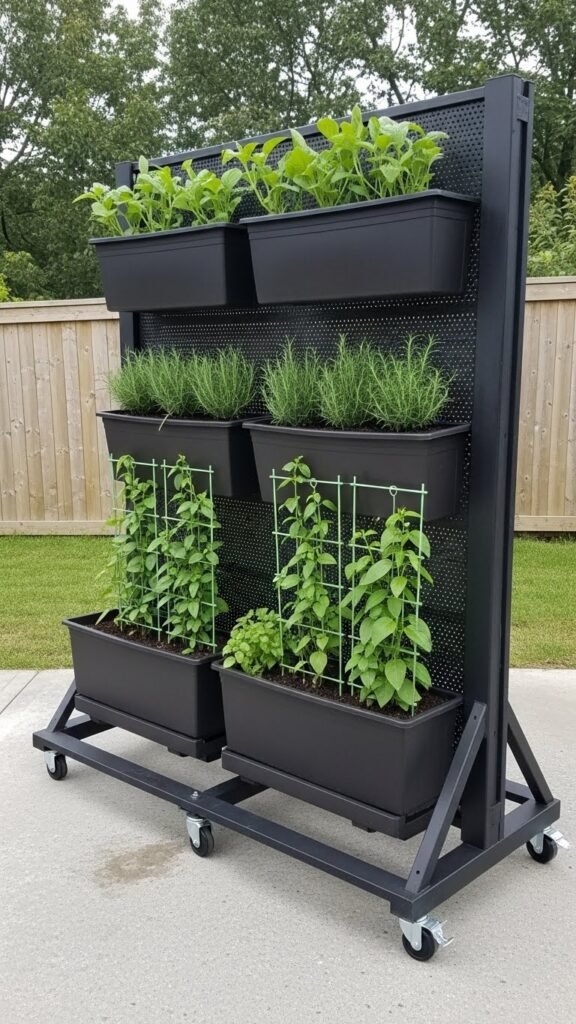Bring a living wall where you need it by mounting planters on a sturdy wheeled frame that moves with your needs. You can arrange portable herbbeds and wheeled planterboxes to screen sightlines, follow sun shifts, and free up ground space.