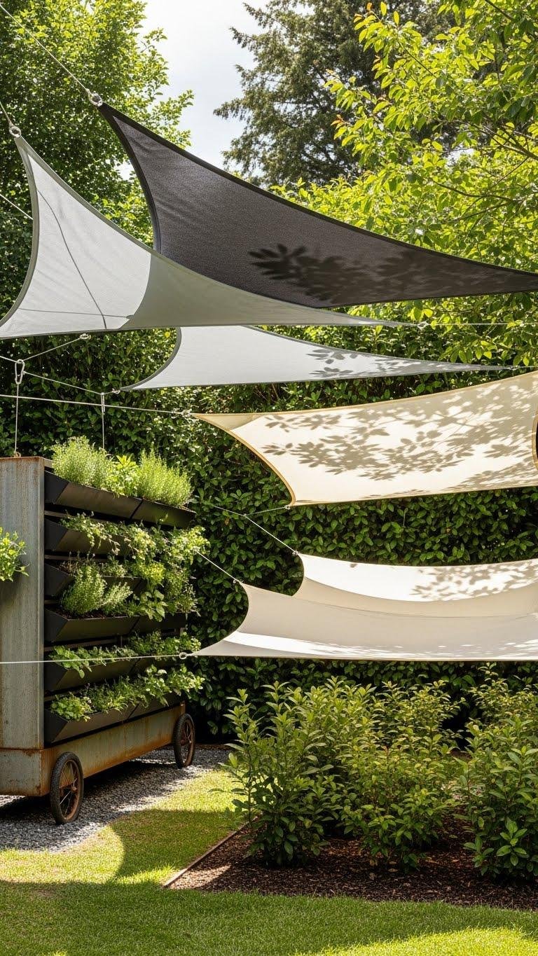You’ll mount sails with careful sail tensioning to avoid sagging, position cloths to protect young shrubs, and pick UV-stable fabrics to limit UV degradation. They free your space while respecting plant light needs.
