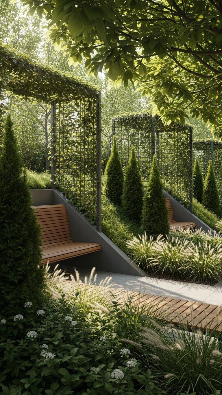 You’ll place benches against berms, trellises or dense planting to form sheltered alcoves that feel private without walls.