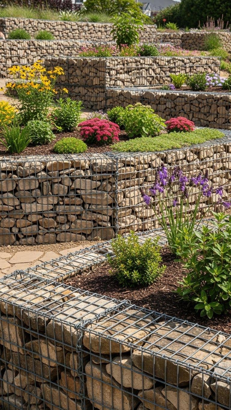 Stack gabions or arrange natural stone to form sturdy, textural walls topped with shallow planting crowns that host drought-tolerant perennials, sedums, or small shrubs.