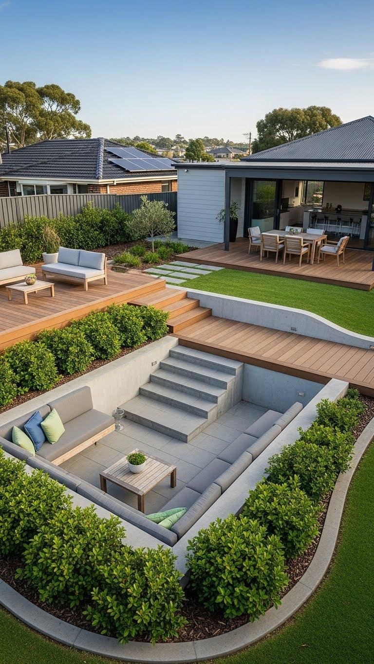 When your yard slopes or you want distinct outdoor rooms, multi-level decking and terraced seating let you shape circulation, sightlines, and planting zones to fit the site and plants you choose.
