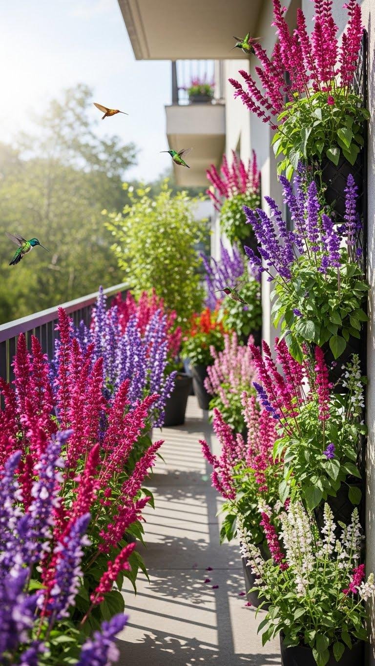Because they shoot up in dramatic spikes of color, salvias make a striking vertical anchor on narrow balconies and small terraces. You’ll enjoy fragrant, hummingbird‑attracting blooms from hardy salvia cultivars that tolerate sun and wind.