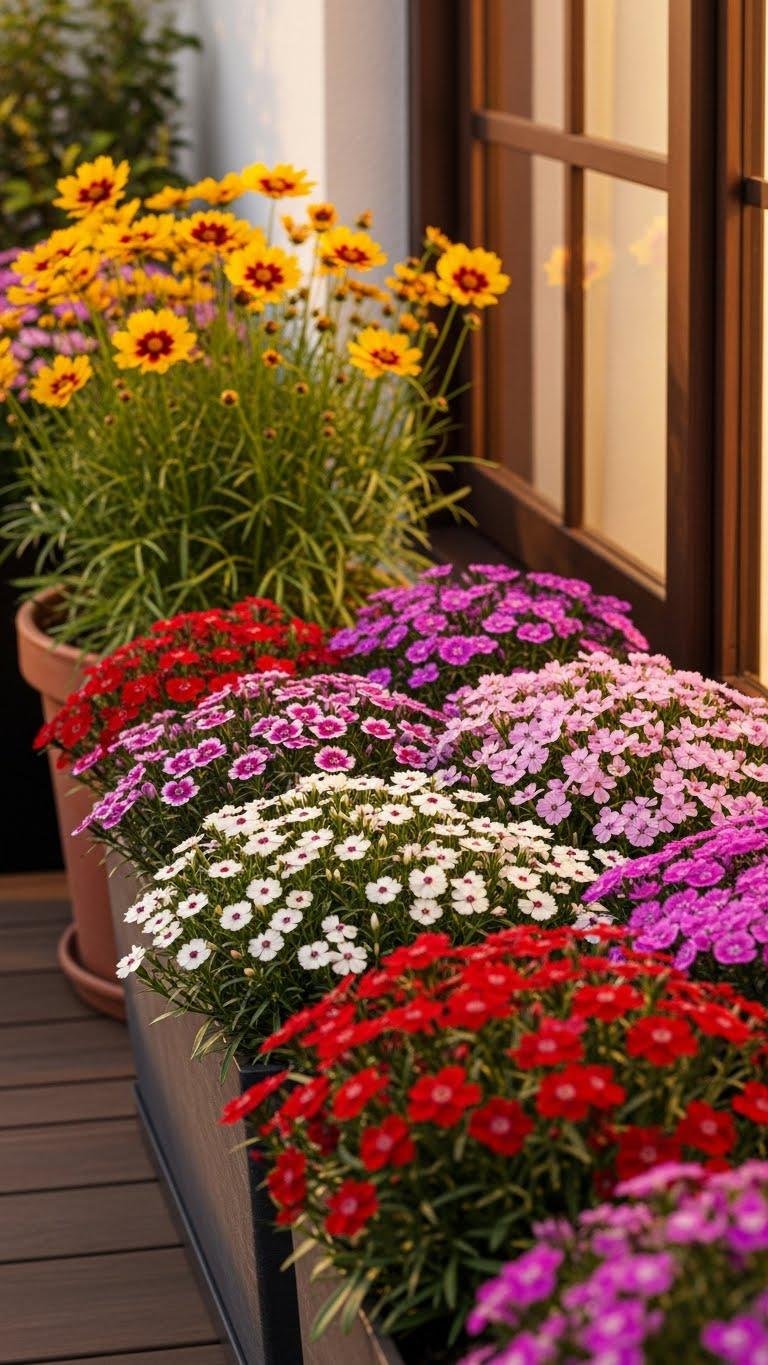 After enjoying coreopsis’ bright, carefree blooms, add dianthus to your balcony to bring compact fragrance and finely detailed flowers right to the edge.