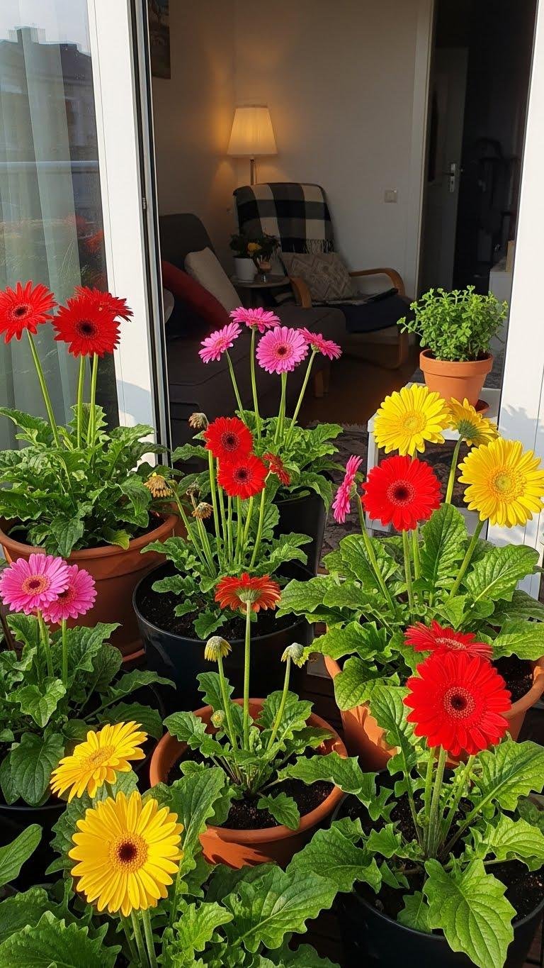 Bring bold color to your balcony with hardy Gerbera daisies — their large, sunburst blooms deliver instant cheer and hold up well in pots and borders.