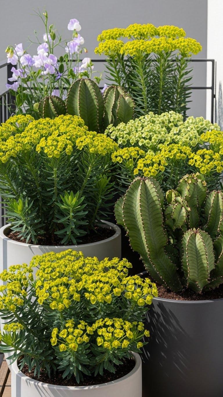 After enjoying the soft fragrance and climbing color of sweet peas, add structural contrast with euphorbias that give your balcony a sculptural backbone.