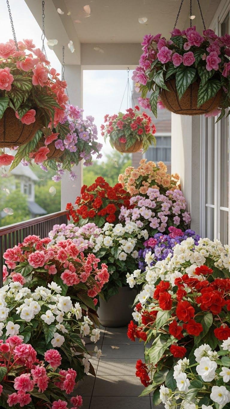 Usually overlooked for sun‑loving showstoppers, begonias shine in shaded balcony nooks with lush foliage and blossom-packed stems that brighten dim corners.