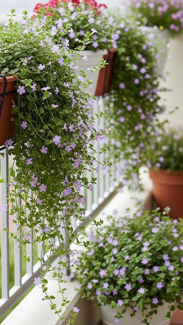 Frequently overlooked, trailing bacopa adds a soft, romantic edge to balcony containers with its delicate stems and profusion of small, five-petaled flowers that spill over pots and railings.