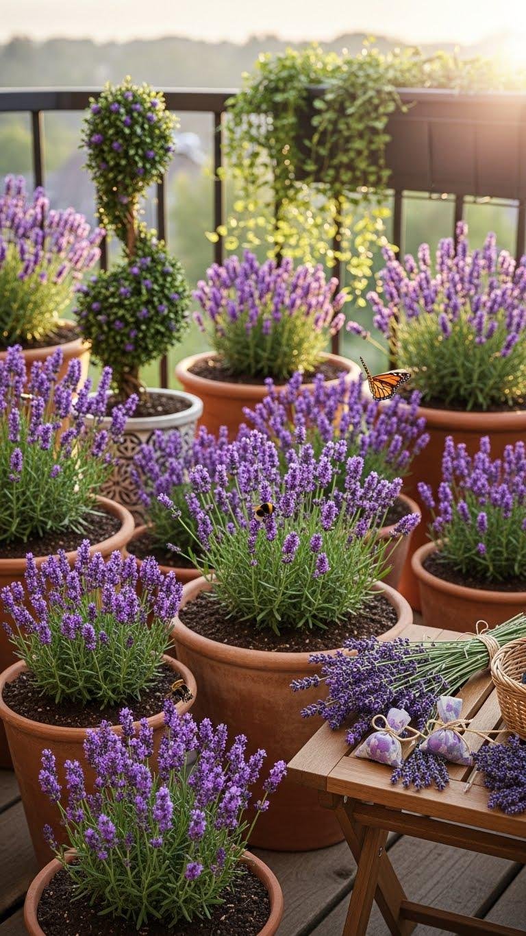 Planting lavender brings immediate fragrance and a steady stream of pollinators to your balcony, filling the air with its calming, herbaceous scent while attracting bees and butterflies.