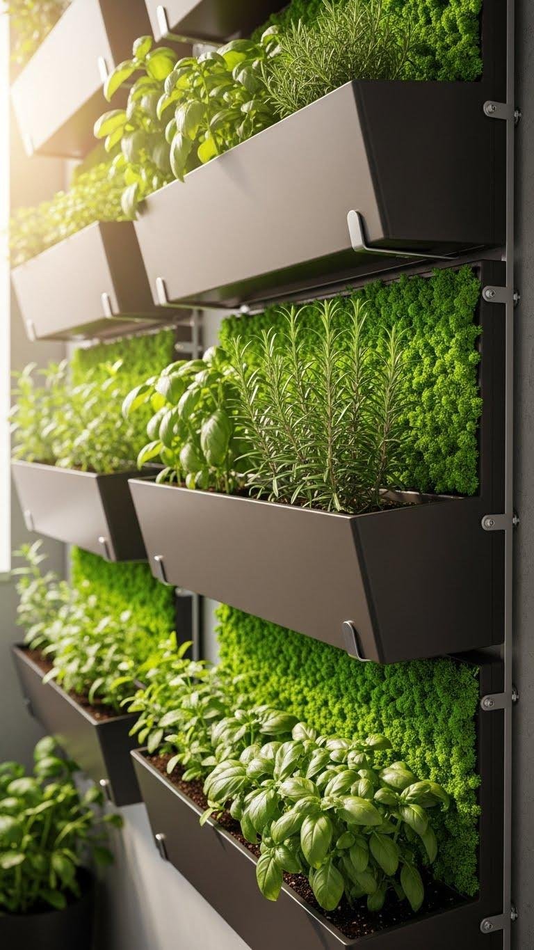 If you want fresh flavors within arm’s reach while cooking, build a vertical herb wall on the sunny side of your balcony using shallow pockets, staggered pots, or a modular planter panel. Place basil, cilantro, chives and compact kitchen microgreens in well-draining mixes; consider vertical hydroponics for water efficiency.