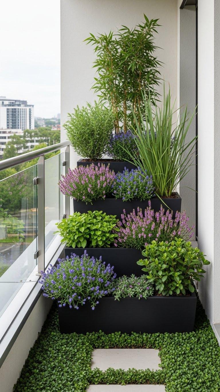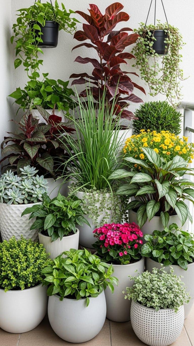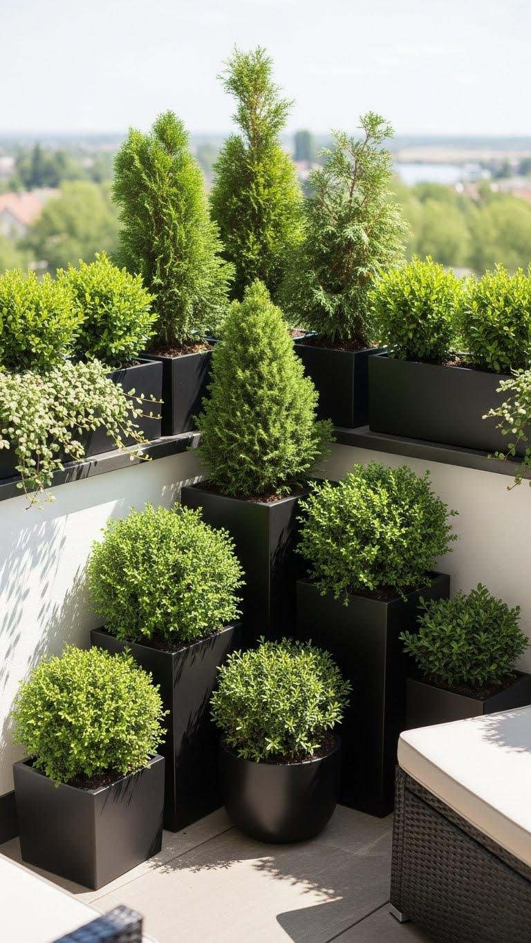 Structure matters: evergreen containers give your balcony reliable form and year-round interest, so place them where they define corners, frame seating, or anchor views.