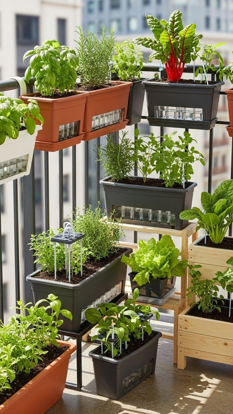 Because balcony space and time are limited, set up self-watering planters so your plants get consistent moisture without daily fuss.