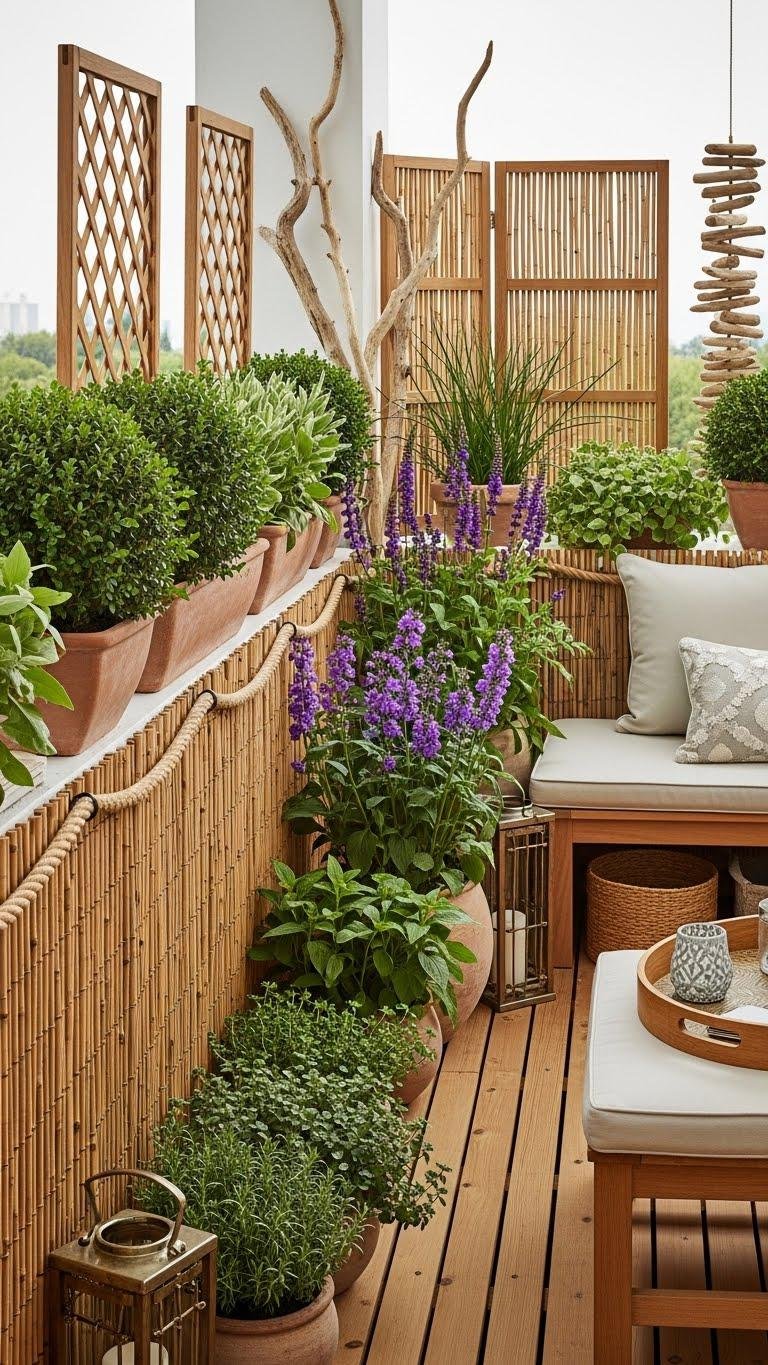 When you carve out a small corner of your balcony for relaxation, favor natural materials—teak slats, woven rope, clay pots—and cluster greenery to create layers of privacy and shade; place taller shrubs or a lattice-backed planter at the windward edge, mid-height perennials at seating level, and low, shallow-rooted herbs near your feet so each plant gets the light and airflow it needs.