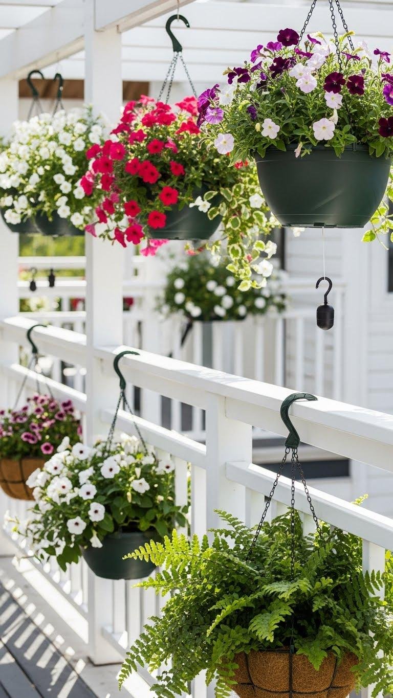By suspending baskets from railings, beams or a sturdy overhead bracket, you free precious floor space while adding another planting plane that catches light and breeze; you’ll want to place heavier, sun-loving pots where they’ll get direct sun and reserve shaded spots for ferns or herbs that prefer less heat.