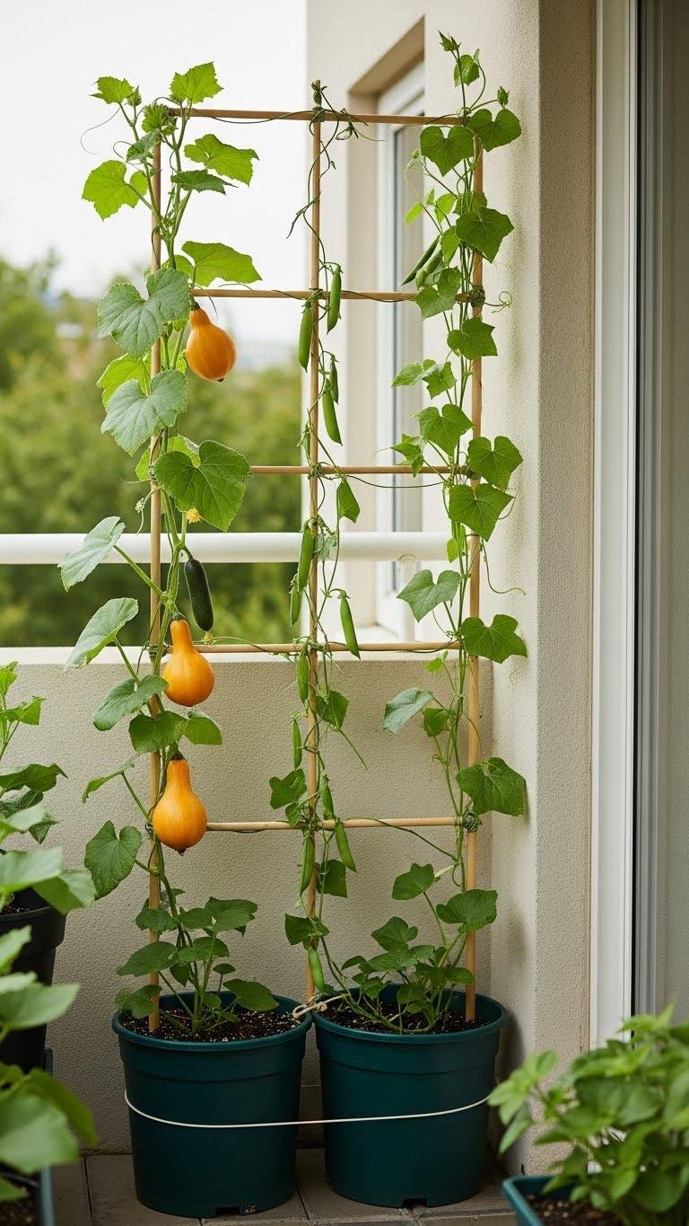 Think vertically to reclaim floor space and give vining vegetables the support they need: a compact trellis channels squash, cucumbers, peas, or beans upward, improving air circulation, sunlight exposure, and harvest accessibility. You’ll build a compact lattice or micro trellis from lightweight wood or PVC, anchor pots securely, train vines with ties, and prune for airflow—freeing space while maximizing yield and mobility on your balcony.