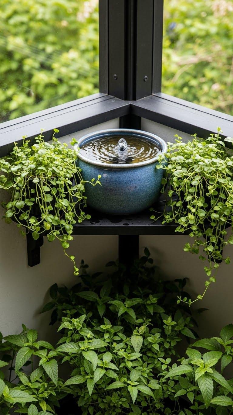 Position a ceramic birdbath or compact mini fountain on a corner shelf or hung planter, route a discreet pump, and choose shade-tolerant moisture-loving greens. You’ll enjoy subtle sound, lower temps, and easy maintenance.