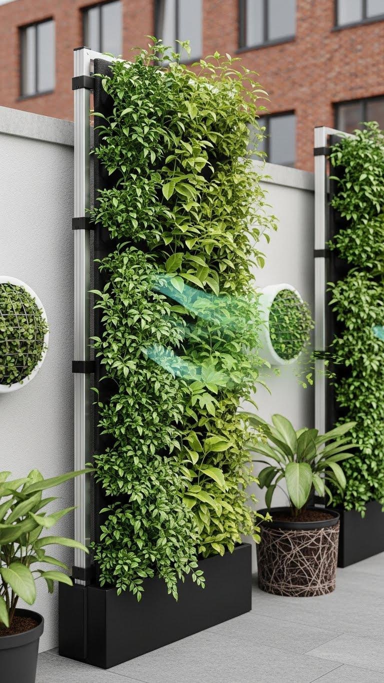 Though small spaces can feel cramped, vertical green screens let you reclaim height for privacy and liveliness without stealing floor room. You’ll mount a sturdy frame, select climbers suited to your exposure, and focus on rootball preparation for healthy establishment.