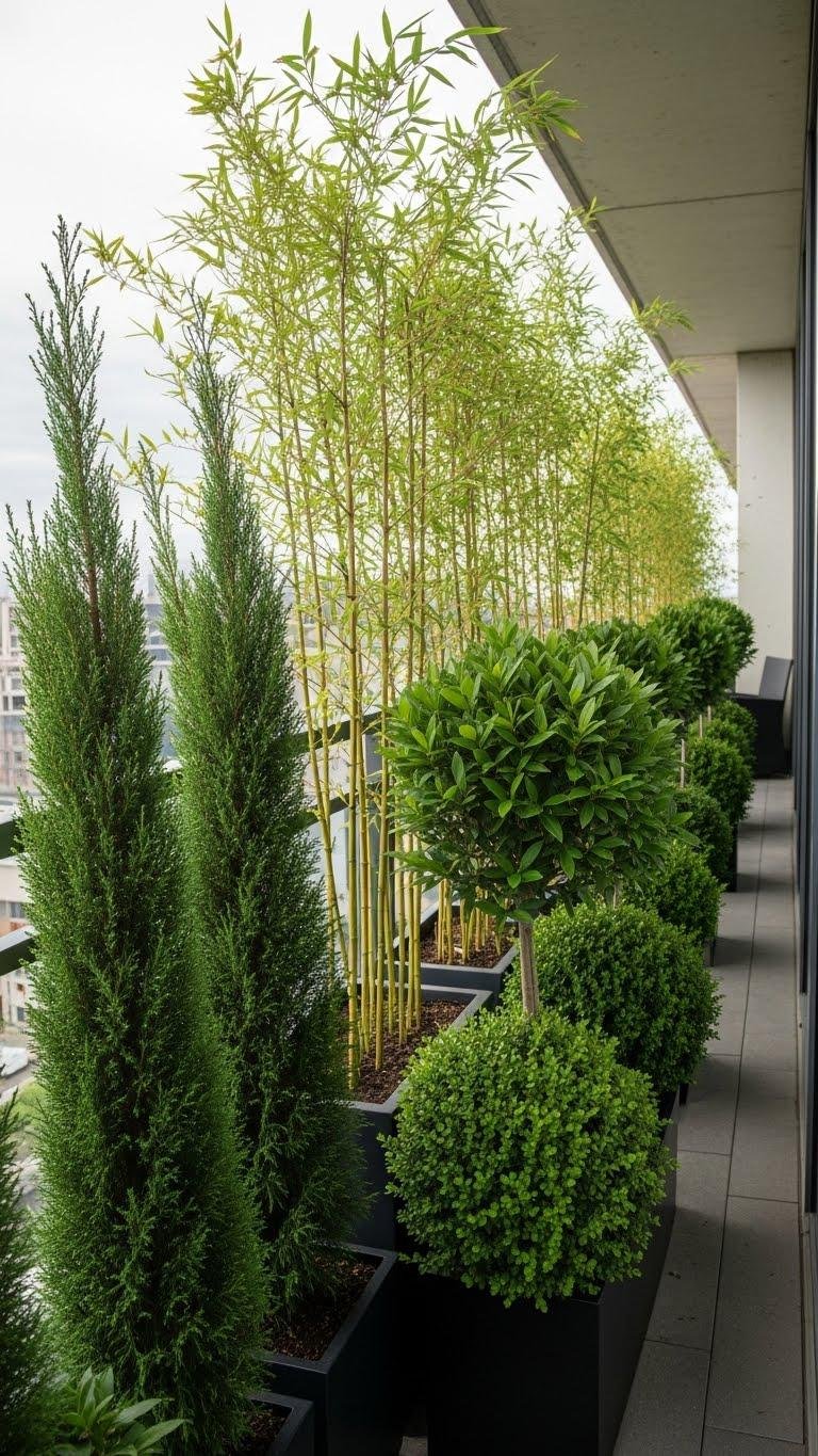 Choose columnar evergreens, bamboo or fast‑growing shrubs, mount a vertical trellis for climbers, and vary pot sizes for staggered heights.