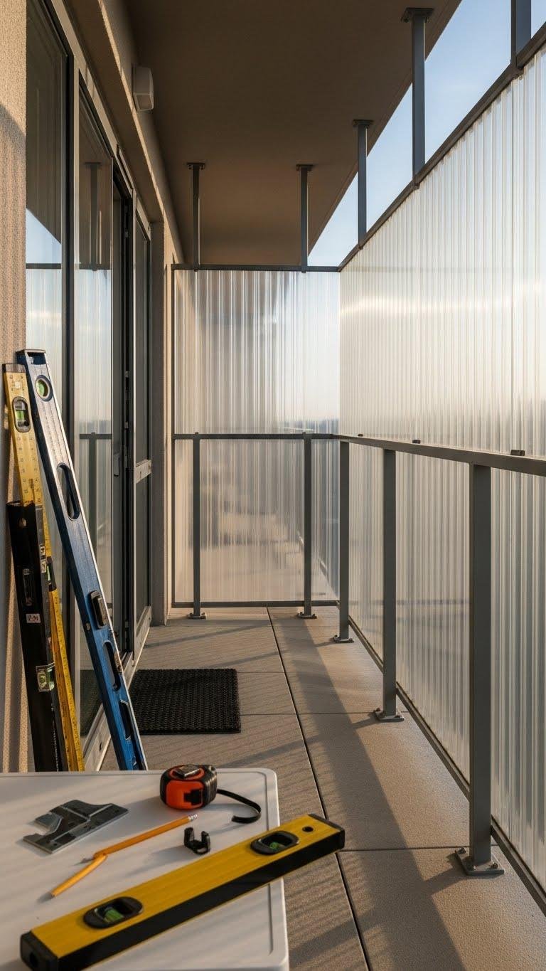 Give your balcony glass railings instant privacy by applying frosted privacy film—it’s a quick, affordable upgrade that still lets light through.