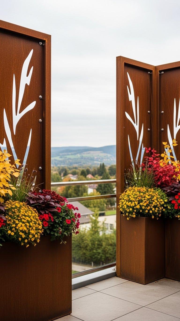 Echoing industrial warmth, corten steel accent screens give your balcony a sculptural, low-maintenance privacy layer that develops a protective, rusted patina over time.