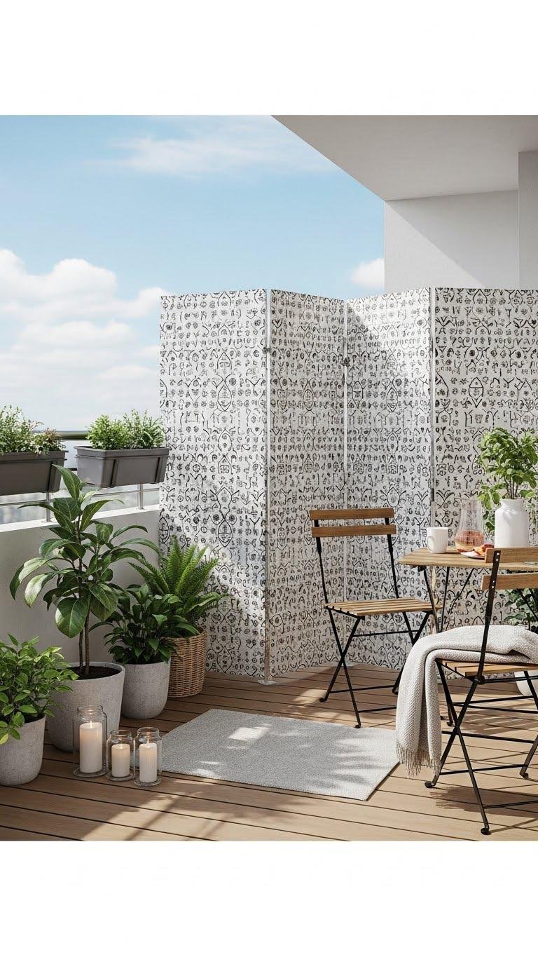 Choose lightweight portable screens with weatherproof frames and breathable privacy textiles—pick patterns, heights, and weighted bases so you can shift, store, or anchor them effortlessly for a liberated balcony life.