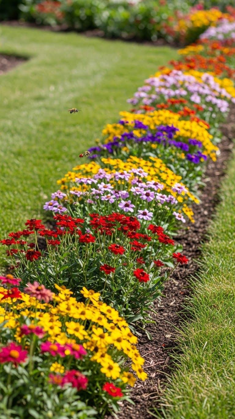 Plant a strip of companion flowers along the edges of your beds to draw in beneficial insects like ladybugs, lacewings, and solitary bees. Choose native bloombeds and diverse blooms to provide nectar, pollen, and shelter.