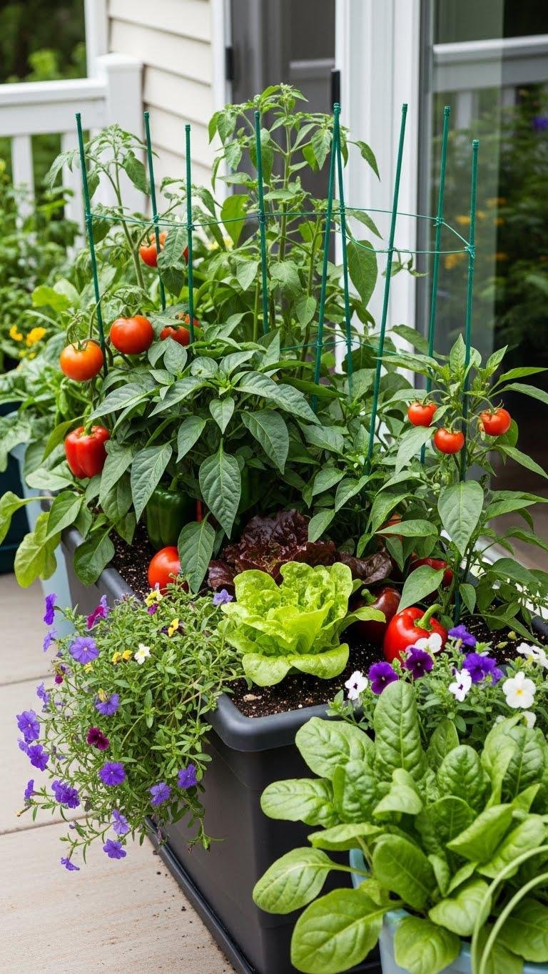 If you’ve added companion flowers to attract pollinators, you can bring those same benefits closer to hand by creating a mixed vegetable container for your patio.