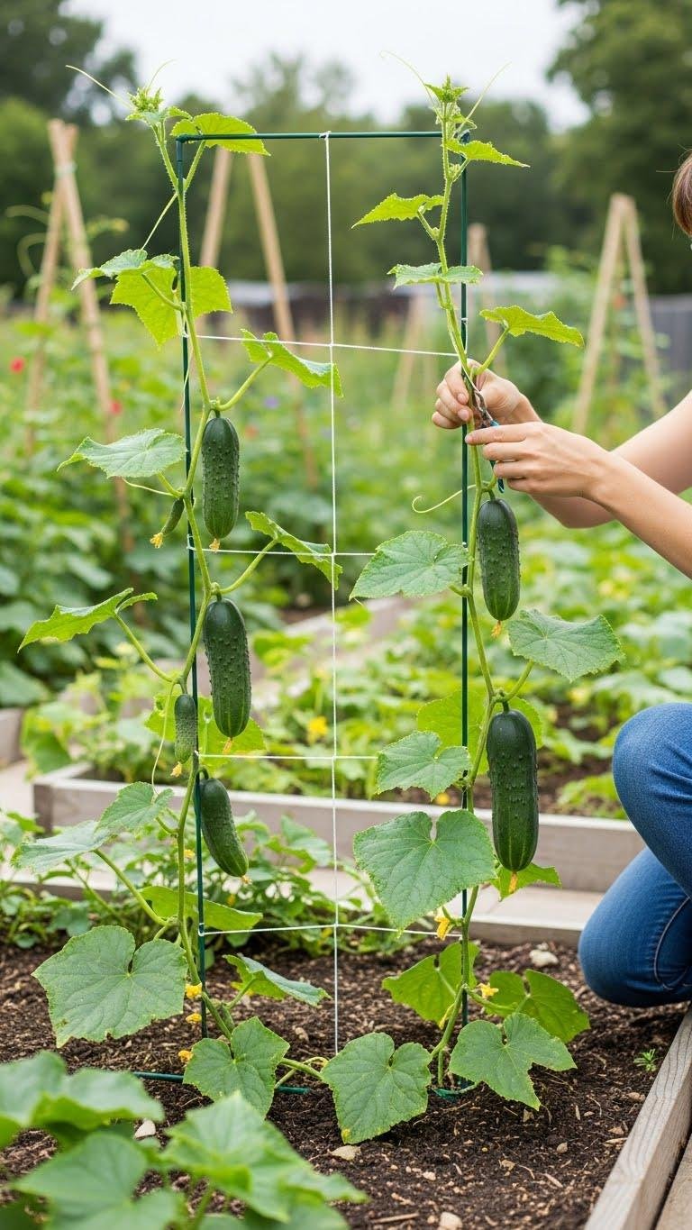 When you train cucumbers up a small trellis, you save space, improve air circulation, and make harvests easier.
