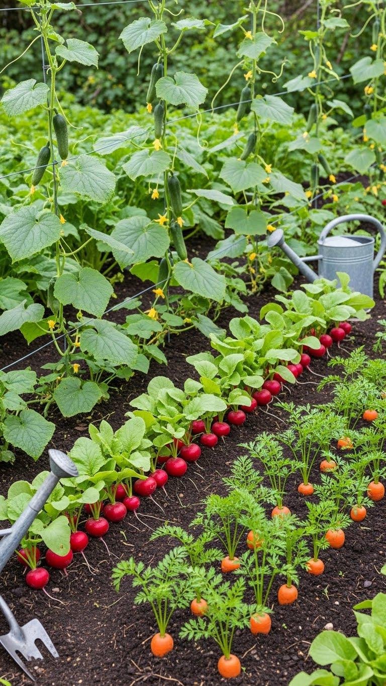 Once your cucumbers are climbing neatly on their trellis, you can free up bed space by sowing quick-growing radishes and carrots nearby—both give fast rewards and keep soil productive between slower crops.
