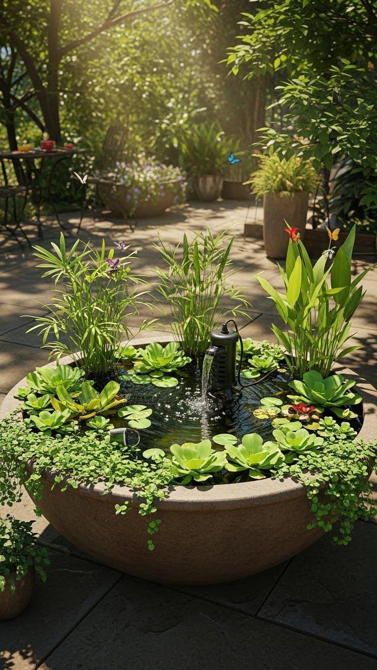 A patio pond in a large pot gives you a living water feature without needing a yard—choose a sturdy, watertight container, line it if necessary, add aquatic soil and plants, and you’ll have a compact, low-maintenance habitat that attracts wildlife and soothes the space.