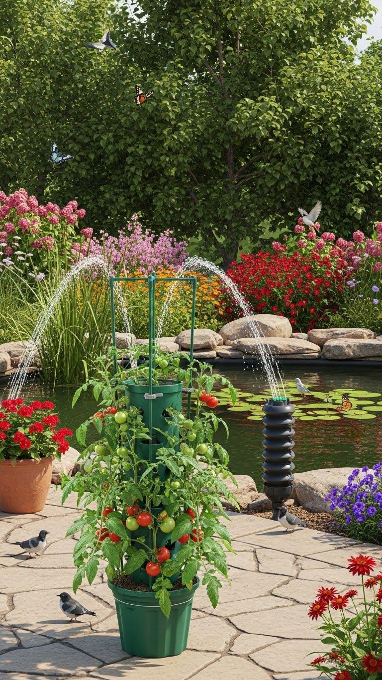 Once your patio pond settles and invites birds and butterflies, you can add a vertical tomato tower to bring fresh fruit into the same small space. Choose a compact tower, secure it, and plant determinate varieties.