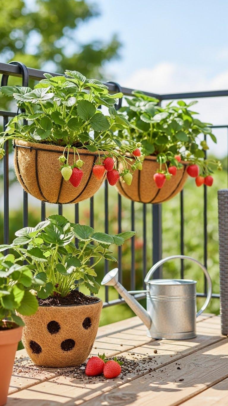 Bring strawberries up where you can see and pick them easily by setting up hanging baskets—it’s a space-saving way to enjoy fresh fruit on a patio or balcony. Choose compact strawberry varieties, use lightweight mix, and make certain baskets have good drainage.
