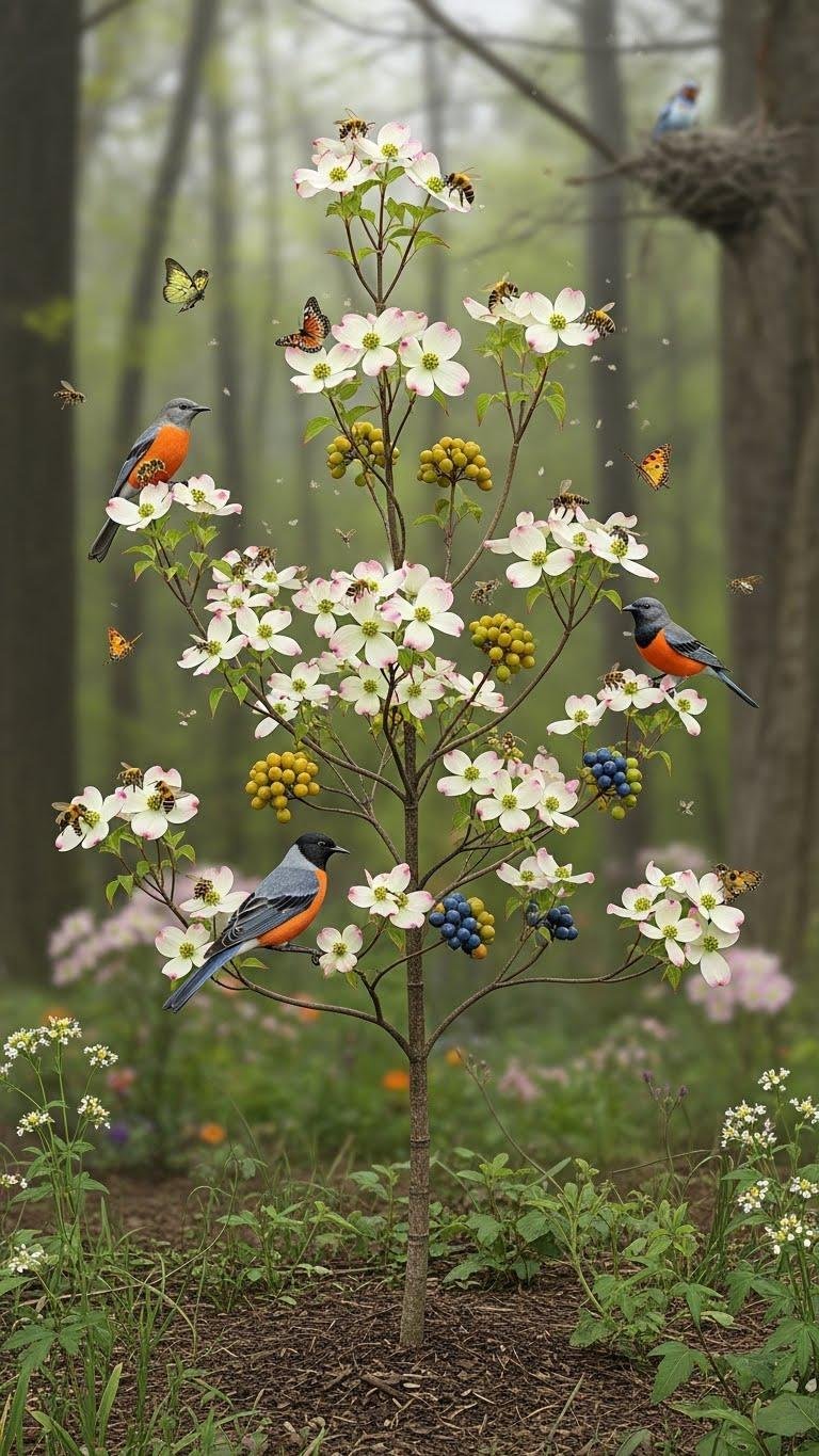 A small-statured tree with outsized ecological value, flowering dogwood (Cornus spp.) provides seasonal nectar, fruit, and structural habitat that benefit pollinators, frugivorous birds, and resident insects across temperate woodlands.
