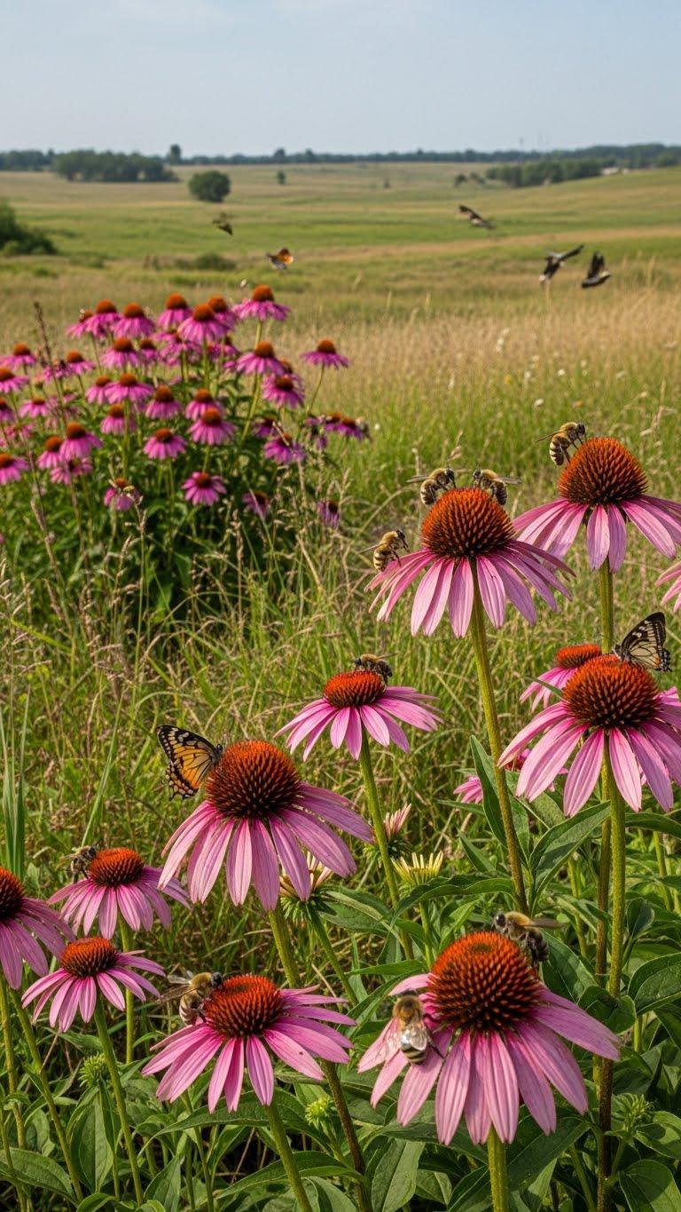 Look for coneflowers (Echinacea spp.) in sunny, open prairie edges and degraded grasslands where well-drained soils and periodic disturbance keep woody encroachment at bay. You’ll value their role in pollinator habitat: nectar attracts bees and butterflies, while seed persistence supports birds through winter. Manage patches with fire or mowing mimicry to maintain open conditions, conserve local genotypes, and promote resilient, place-based populations.