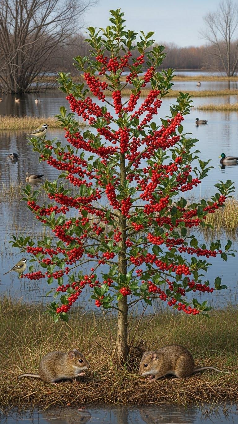 Plant winterberry holly (Ilex verticillata) where moist soils and seasonal flooding recreate its native wetland edges, because this deciduous holly produces copious red drupes that sustain overwintering songbirds, waterfowl, and small mammals when other food is scarce. You’ll manage winterberry propagation via cuttings or seed; prioritize female plants and pollinators, apply targeted fruiting maintenance, and monitor hydrology to conserve local bird populations.