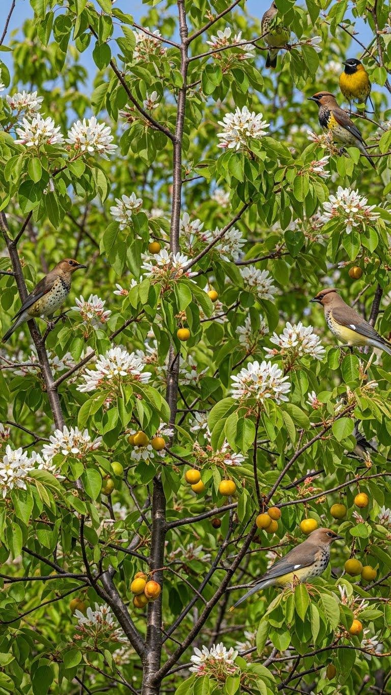 Moving from wetland margins where winterberry sustains waterfowl and overwintering songbirds, consider serviceberry (Amelanchier spp.), a native understory tree-shrub that supports breeding and migratory bird populations through spring nectar, summer fruits, and structural habitat.