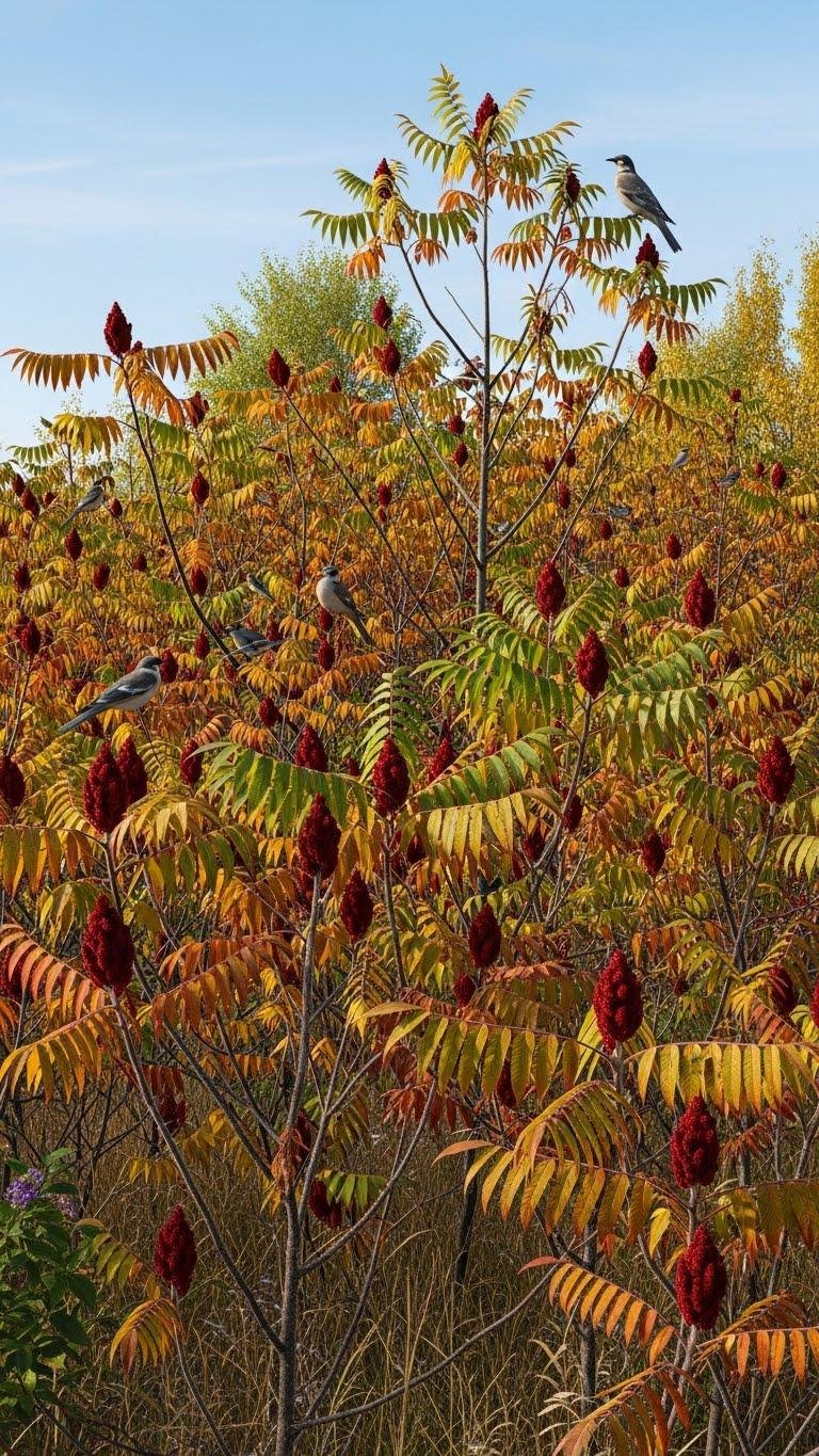 Just as hackberry supplies summer fruit and structural habitat, sumacs (Rhus spp.) offer a different seasonal resource profile that benefits birds across the year. You’ll plant dense colonies that create wildlife shelter, nesting sites, and food in fall and winter. Their native adaptation supports local biodiversity, and traditional medicinal uses inform respectful management. You’ll rely on these shrubs for resilient, freedom-minded conservation.