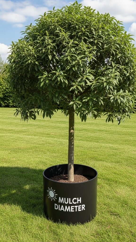 When you match the mulch well to your tree’s canopy diameter, you maximize moisture capture and root protection while minimizing competition from weeds and turf; measure the drip line and extend the mulch out to that edge so water and nutrients soak into the feeder root zone.