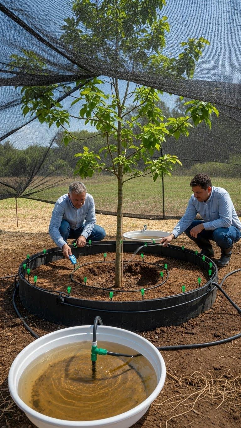You’ll use drip emitters calibrated for flow, monitor soil moisture, and protect young trees with shade cloth in extreme heat. Consistent, timed irrigation maximizes survival, yield, and return on investment.