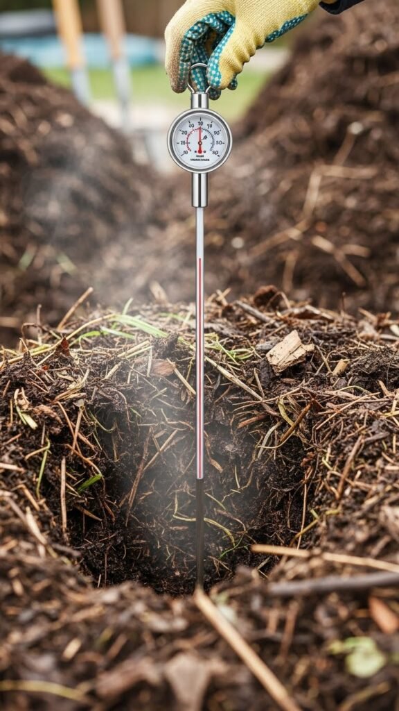 Check the pile’s temperature regularly with a compost thermometer so you know whether decomposition is progressing and when to adjust moisture, aeration, or materials.