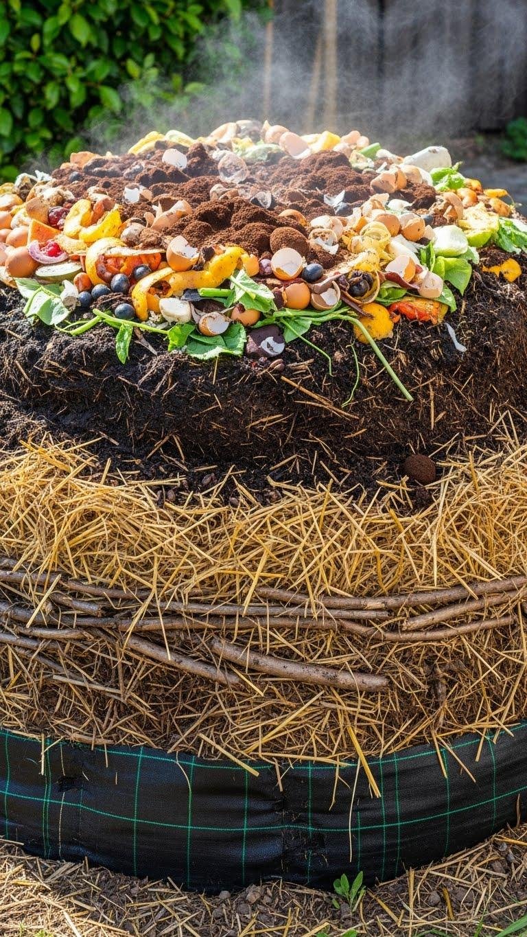 Under a layer of kitchen scraps, add a base of straw or small twigs to improve drainage and keep your pile from becoming waterlogged. You’ll create airflow, reduce rot, and speed decomposition.