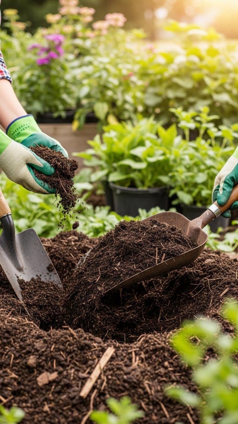 Spread a 1–2 inch layer of finished compost around the base of your plants to conserve moisture, moderate soil temperature, and slowly feed roots.