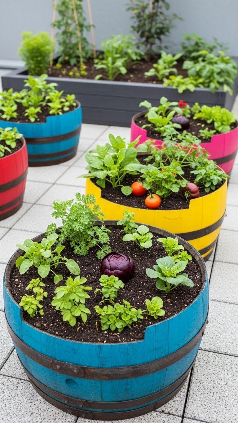 If you’re short on ground space but want a big vegetable yield, convert recycled barrels into raised beds to maximize growing area and control soil quality.