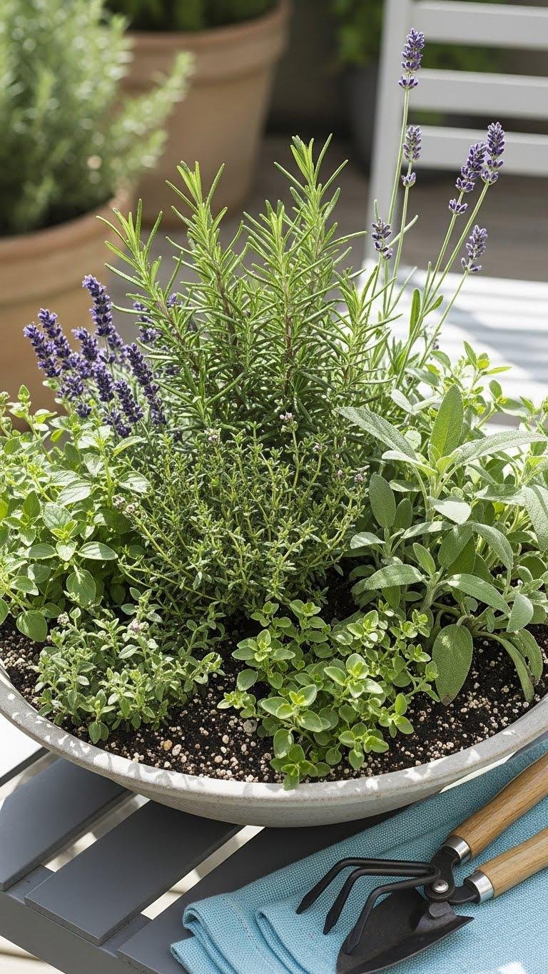 Because Mediterranean plants love sun and good drainage, you can create a compact, fragrant container by combining rosemary, thyme, oregano, sage, and a few lavender stems in a wide shallow pot filled with gritty, well-draining mix.