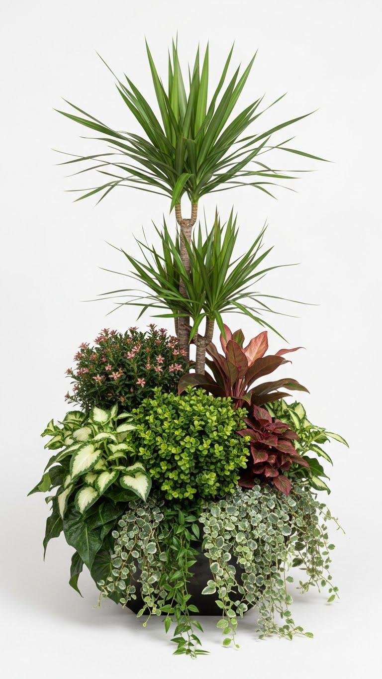 Start with a clear vertical plan: place a tall anchor plant at the back or center, fill mid-height with bushy, structural varieties, and let trailing species soften edges and cascade over the container.