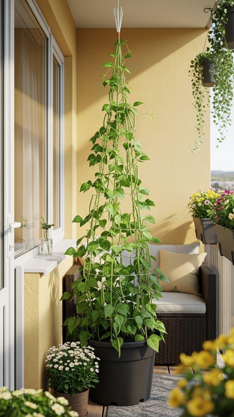 It’s trend-aware, low-cost, and frees your balcony floor while delivering fresh beans and a leafy privacy screen.