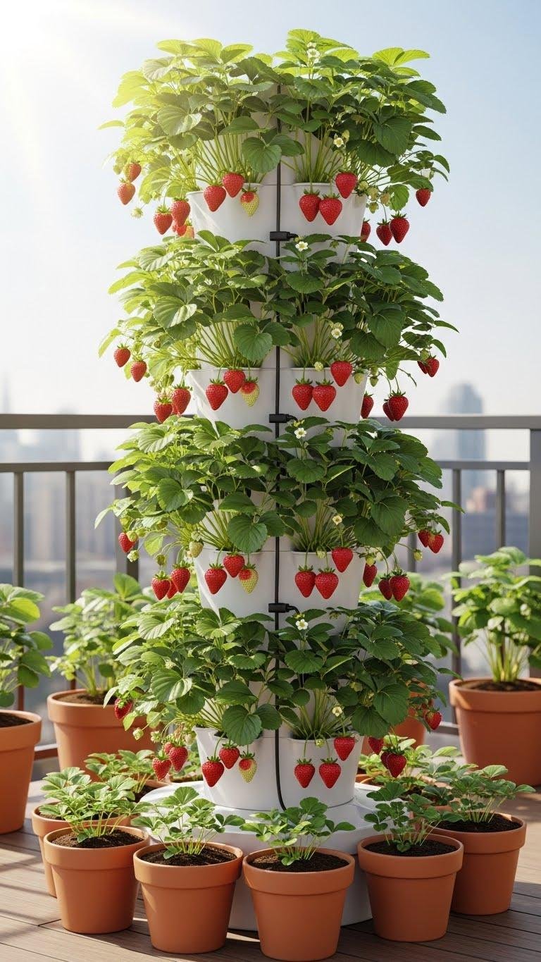 Stacking strawberries upward saves space and keeps fruit cleaner, making a vertical tower a smart choice if you want fresh berries from a balcony or tiny yard.